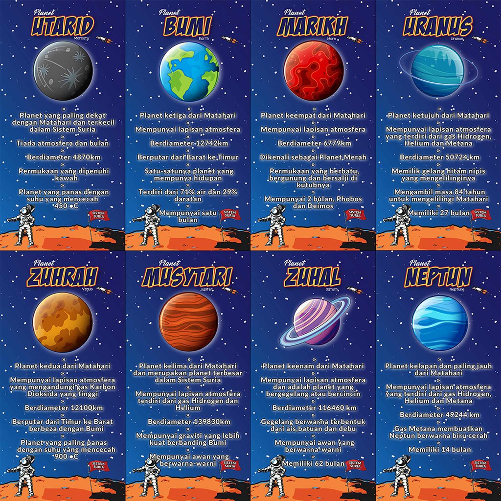 Planet Planet Dalam Sistem Suria - Sistemsuria terdiri daripada matahari, 9 buah planet, asteroid, komet, meteor dan meteoroit.. Dalam kategori ini adalah 8 planet yang membentuk sistem suria. Zuhal mempunyai satu sistem gelang atau cincin yang utama terdiri kebanyakkannya dari air batu dengan sejumlah kecil serpihan batuan dan debu. Sistemsuria terdiri daripada matahari, 9 buah planet, asteroid, komet, meteor dan meteoroit. Ia juga merupakan planet yang terkecil dalam sistem suria. Planet utarid (mercury) merupakan planet paling dekat dengan matahari diikuti dengan venus, bumi, marikh (mars), musytari (jupiter.