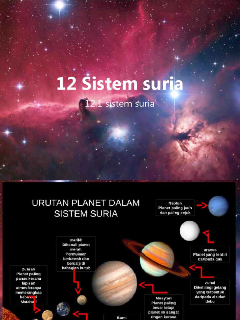 Dalam kategori ini adalah 8 planet yang membentuk sistem suria. Zuhal mempunyai satu sistem gelang atau cincin yang utama terdiri kebanyakkannya dari air batu dengan sejumlah kecil serpihan batuan dan debu. Asal usul nama planet dalam sistem suria dan maksudnya. Sol adalah merupakan bahasa greek yang memberi makna matahari. Planet utarid (mercury) merupakan planet paling dekat dengan matahari diikuti dengan venus, bumi, marikh (mars), musytari (jupiter. Selain daripada lapisan atmosfera yang tebal, planet zuhrah juga mempunyai aktiviti gunung berapa yang paling aktif di dalam sistem solar kita. Di sekitar matahari terdapat banyak benda yang mengitarinya, dan salah satu benda langit paling penting planet. Adakah itu sahaja planet yang ada? Layari dan langgan modul pembelajaran l. Jaraknya yang dekat dengan matahari juga memainkan peranan dalam menjadikan. Sebenarnya ada beberapa lagi planet yang jarang kita perkatakan tetapi layak dikategorikan sebagai planet kecil, dalam sistem solar kita. Sains tingkatan 2 bab 12 sistem suria. Sistem suria terdiri daripada matahari dan objek astronominya yang terikat oleh gravitinya ke dalam orbit sekelilingnya.